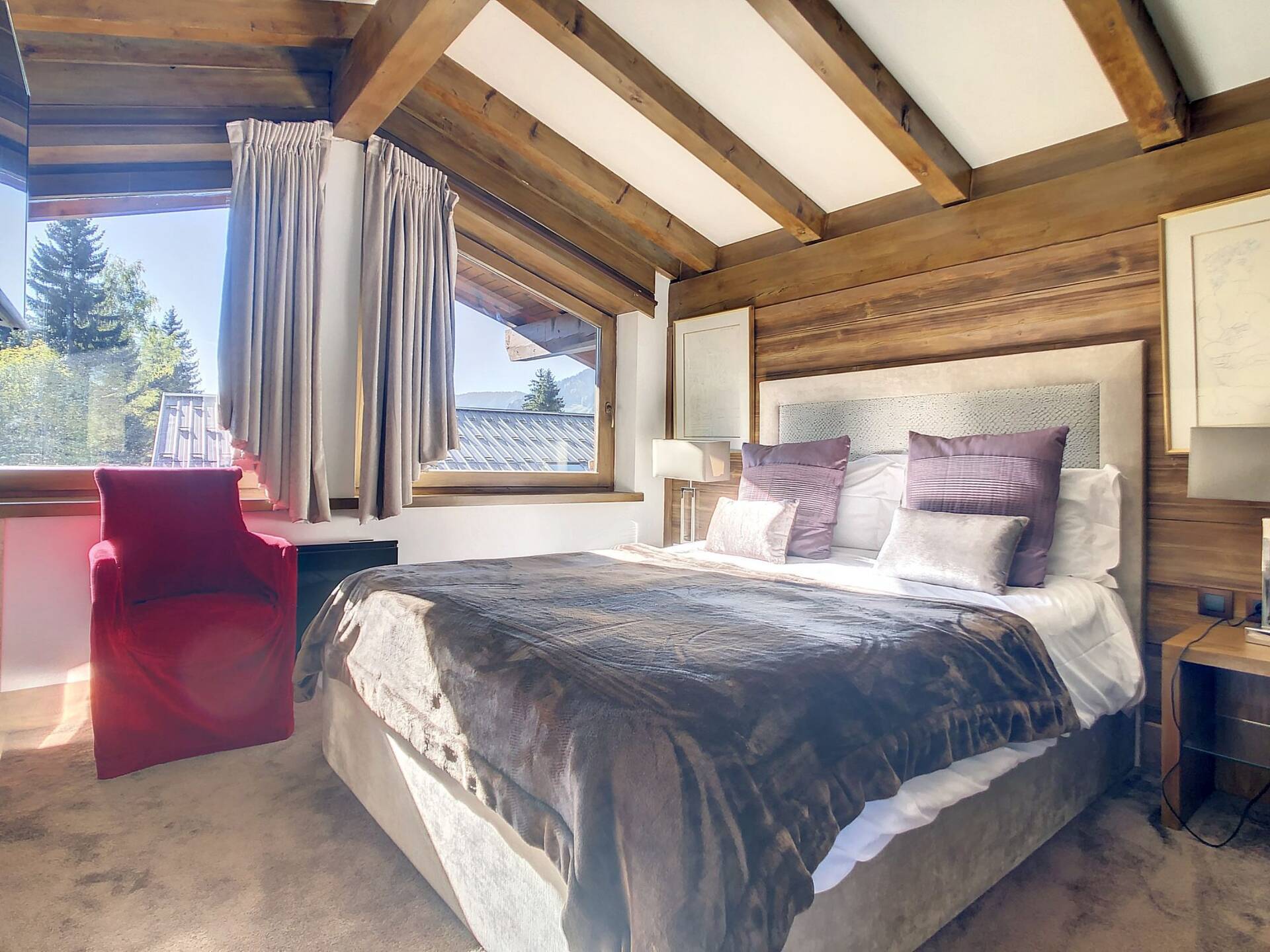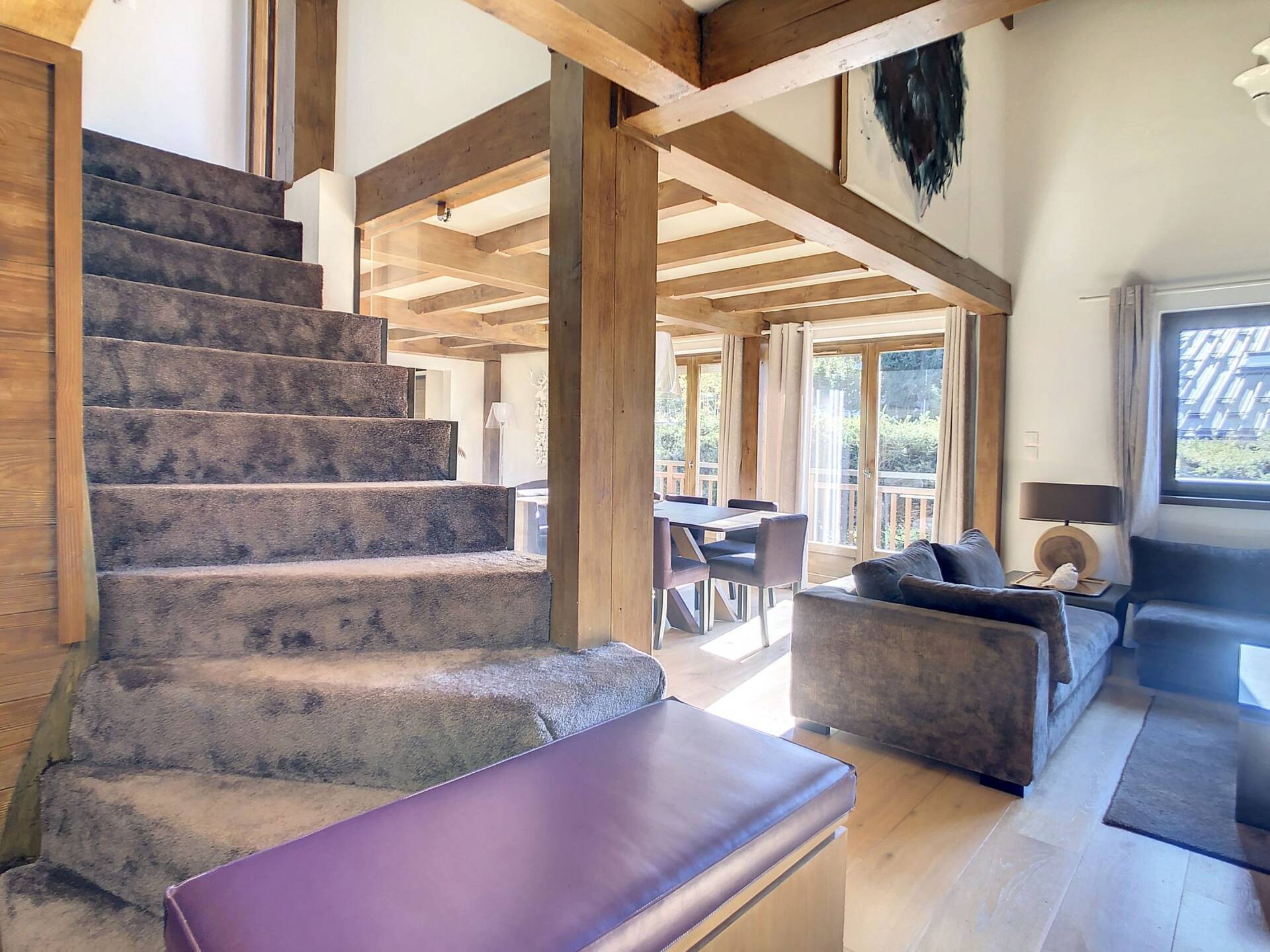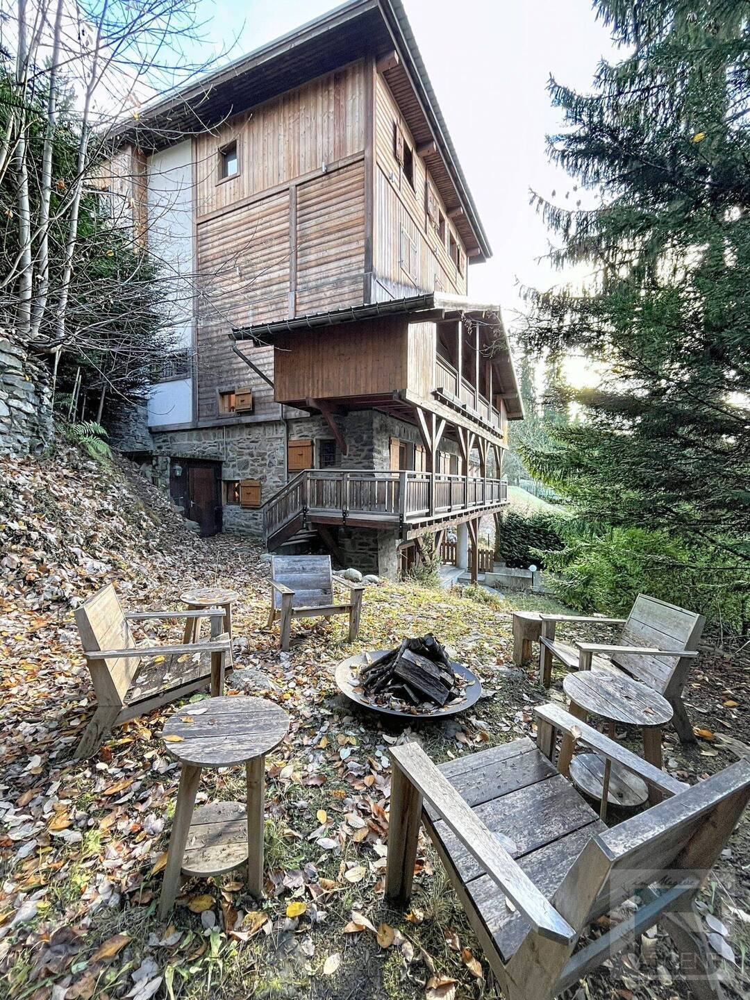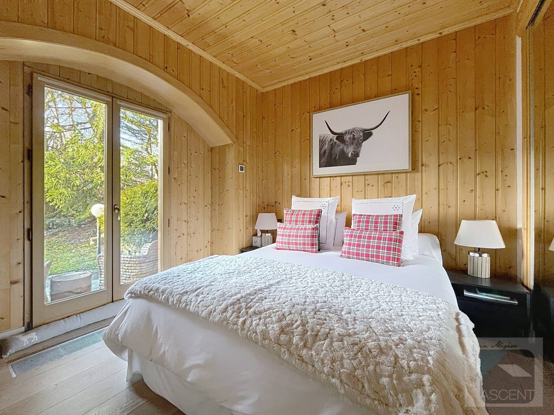L'appartement en triplex avec double entrée dont une indépendante, donne l'impression de vivre dans un chalet. Il est distribue? comme suit : Au rez-de-jardin: 1 chambre double (lit 160 x200 cm) avec acce?s au jardin ; 1 chambre avec un double (lit 140 x200 cm) avec acce?s au jardin et 1 chambre avec lit superpose? ; 1 salle-de-bain luxueuse avec 1 grande baignoire et 1 douche a? l'italienne se?pare?e ; toilettes se?pare?es. Etage intermédiaire : 1 cuisine ame?ricaine équipée ; 1 salle-a?-manger (30m2), chemine?e et acce?s aux balcons (vue donnant sur les sapins et les montagnes) ; 1 chambre double (lit 160 x200) avec dressing, salle-de-bain et toilettes se?pare?es. Etage supe?rieur : 1 cuisine ame?ricaine ouverte sur un grand salon (40m2) avec chemine?e et acce?s aux balcons, (vue sur les sapins et les montagnes) ; 1 chambre double (lit de 160 x200) ; 1 salle-de-bain avec jacuzzi ; toilettes se?pare?es ; Grand ski room à l'entrée. A l'exte?rieur : 1 jardin privatif (500m2) joliment arbore? avec 1 un espace 'fire pit' (pour faire des feux de camp le soir autour d'un ape?ritif) ; 1 sauna inde?pendant et 1 garage double garage (accès direct à l'appartement).
