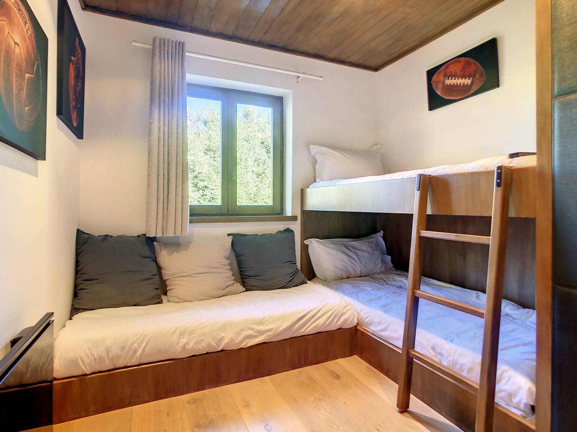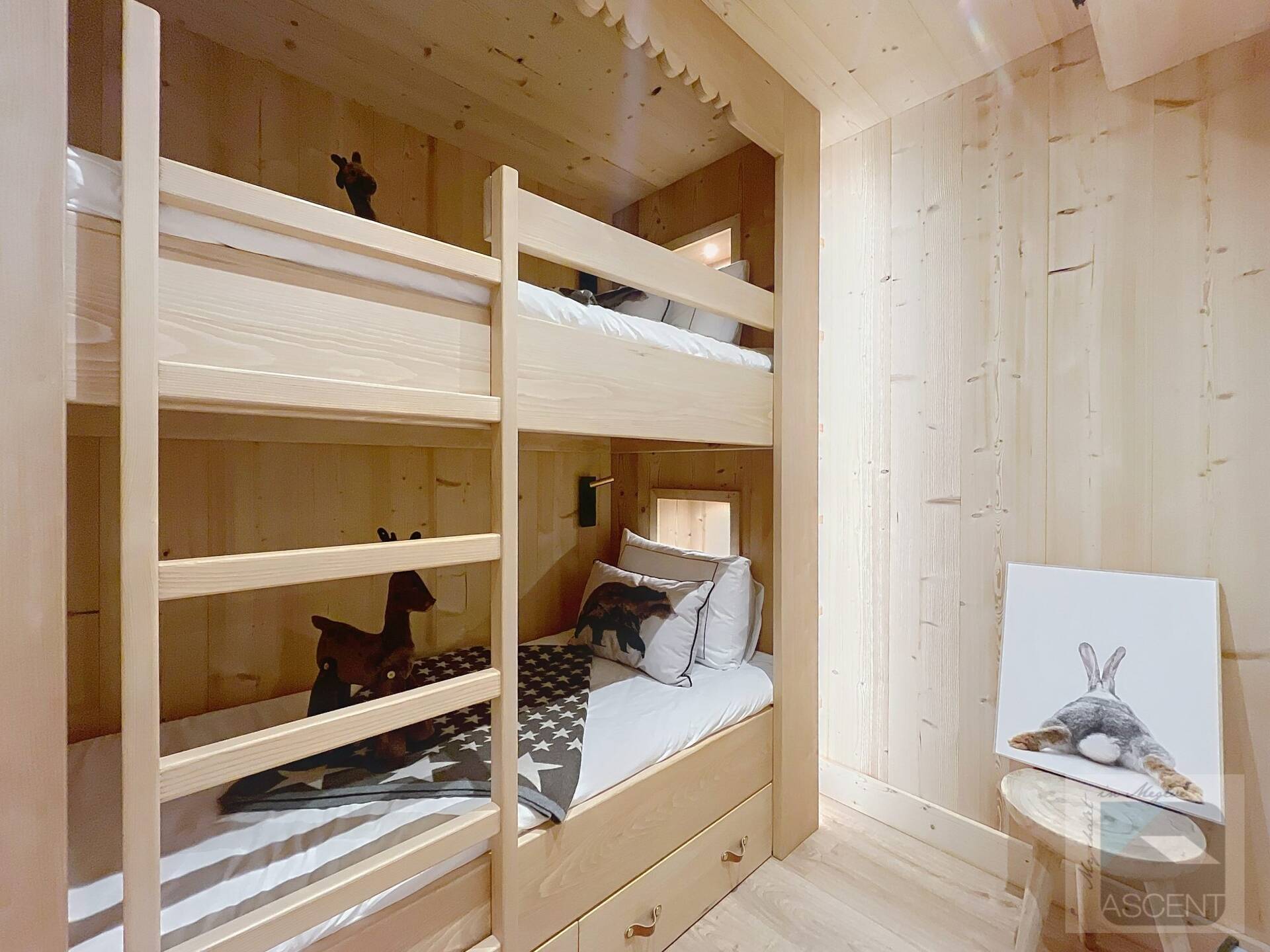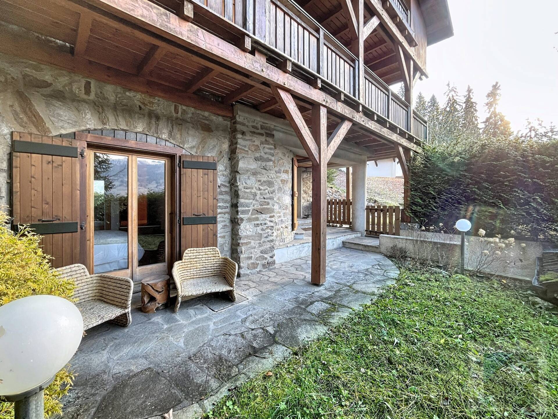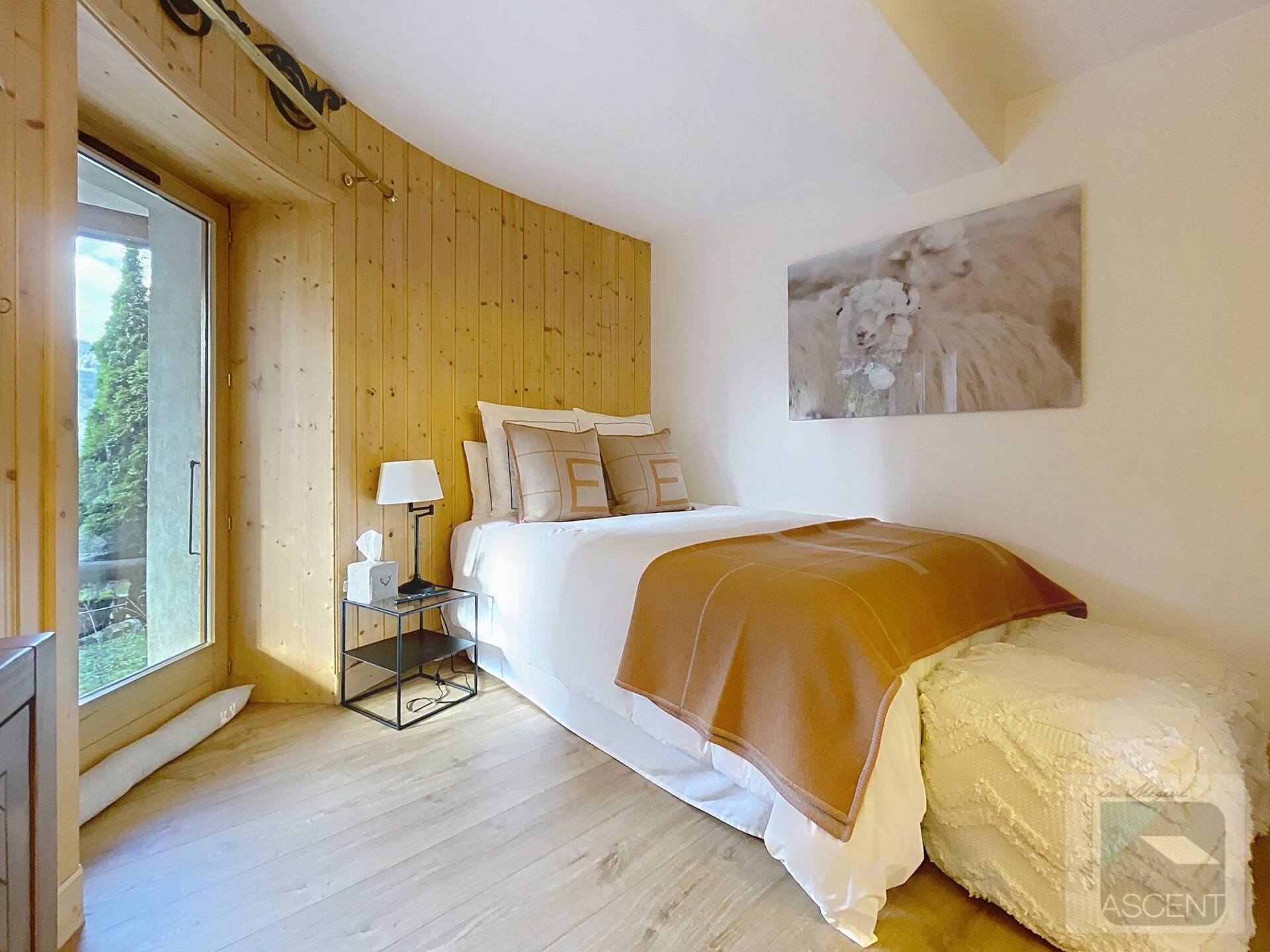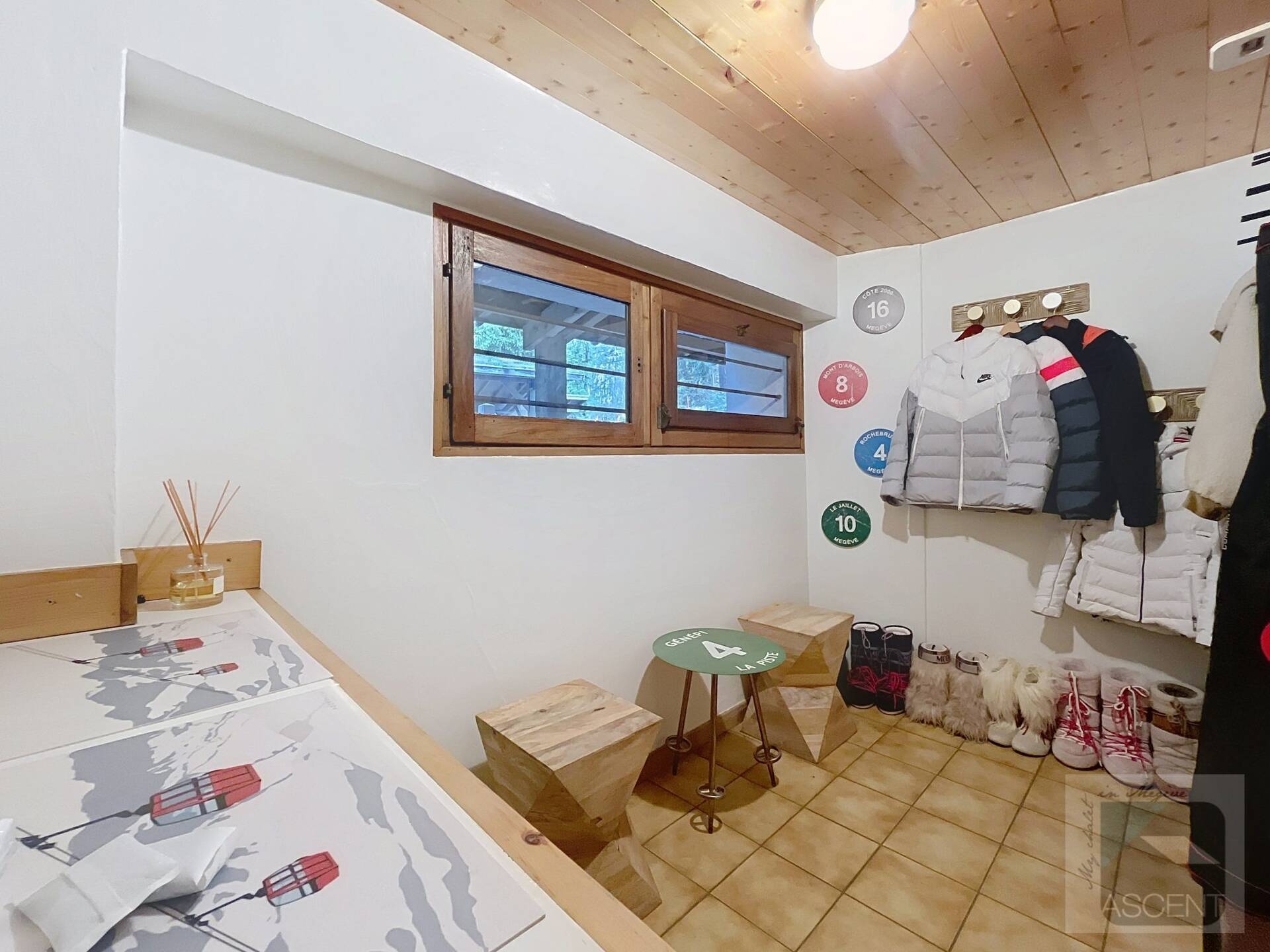 L'appartement en triplex avec double entrée dont une indépendante, donne l'impression de vivre dans un chalet. Il est distribue? comme suit : Au rez-de-jardin: 1 chambre double (lit 160 x200 cm) avec acce?s au jardin ; 1 chambre avec un double (lit 140 x200 cm) avec acce?s au jardin et 1 chambre avec lit superpose? ; 1 salle-de-bain luxueuse avec 1 grande baignoire et 1 douche a? l'italienne se?pare?e ; toilettes se?pare?es. Etage intermédiaire : 1 cuisine ame?ricaine équipée ; 1 salle-a?-manger (30m2), chemine?e et acce?s aux balcons (vue donnant sur les sapins et les montagnes) ; 1 chambre double (lit 160 x200) avec dressing, salle-de-bain et toilettes se?pare?es. Etage supe?rieur : 1 cuisine ame?ricaine ouverte sur un grand salon (40m2) avec chemine?e et acce?s aux balcons, (vue sur les sapins et les montagnes) ; 1 chambre double (lit de 160 x200) ; 1 salle-de-bain avec jacuzzi ; toilettes se?pare?es ; Grand ski room à l'entrée. A l'exte?rieur : 1 jardin privatif (500m2) joliment arbore? avec 1 un espace 'fire pit' (pour faire des feux de camp le soir autour d'un ape?ritif) ; 1 sauna inde?pendant et 1 garage double garage (accès direct à l'appartement).
