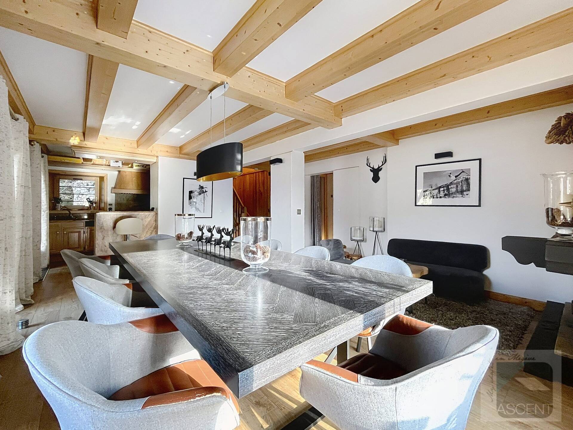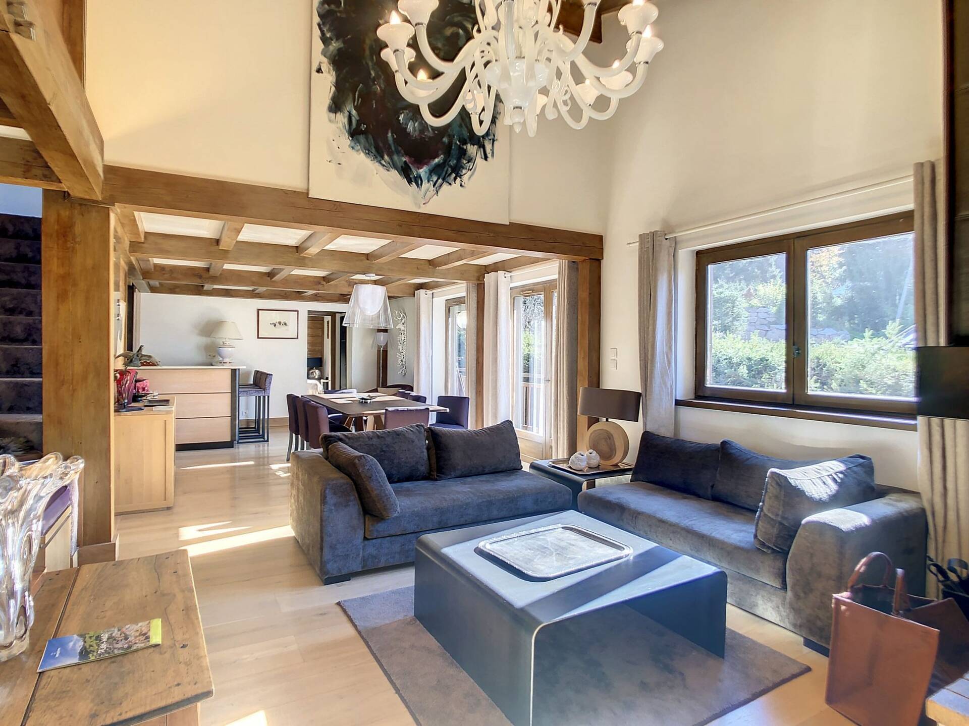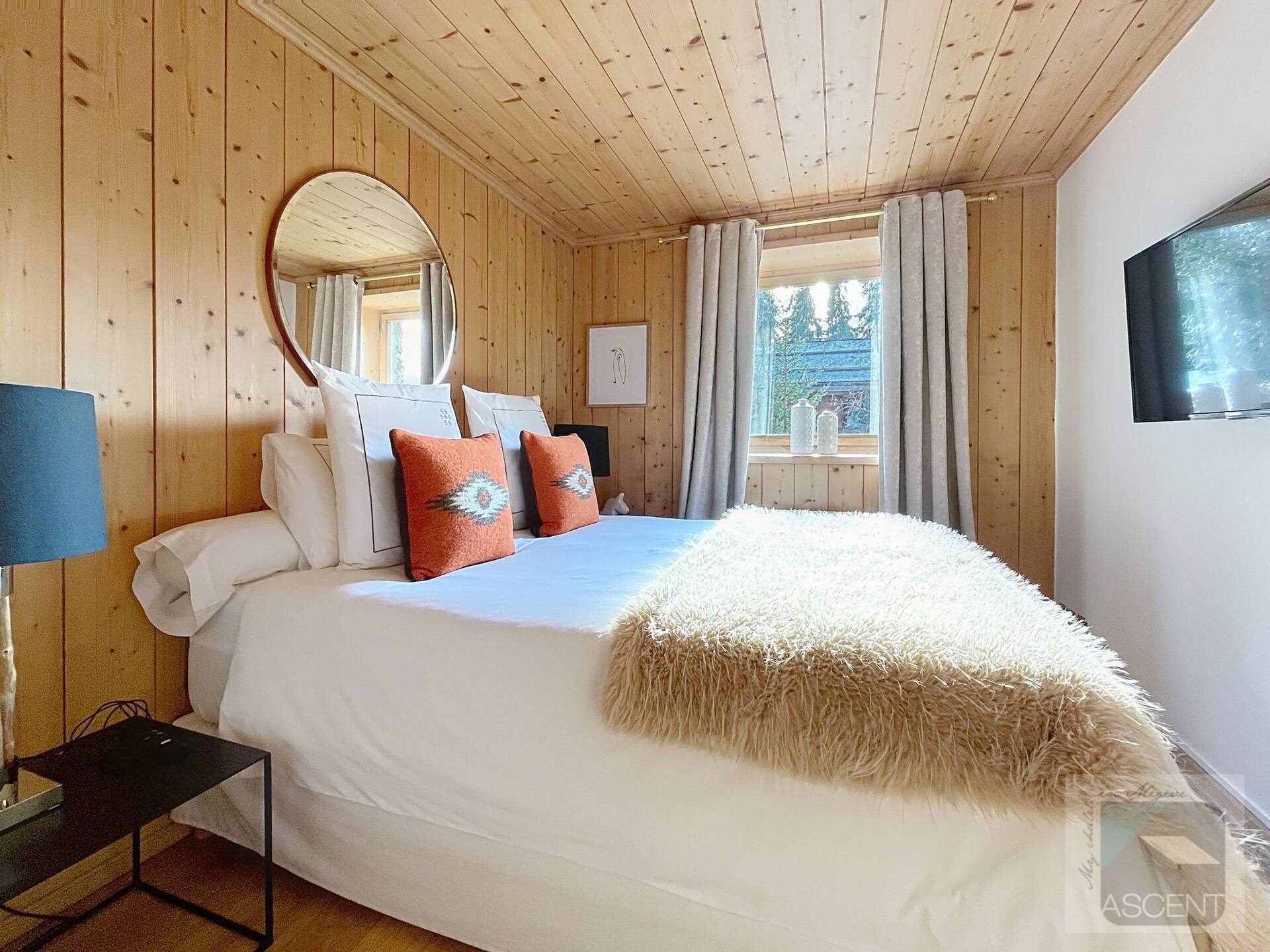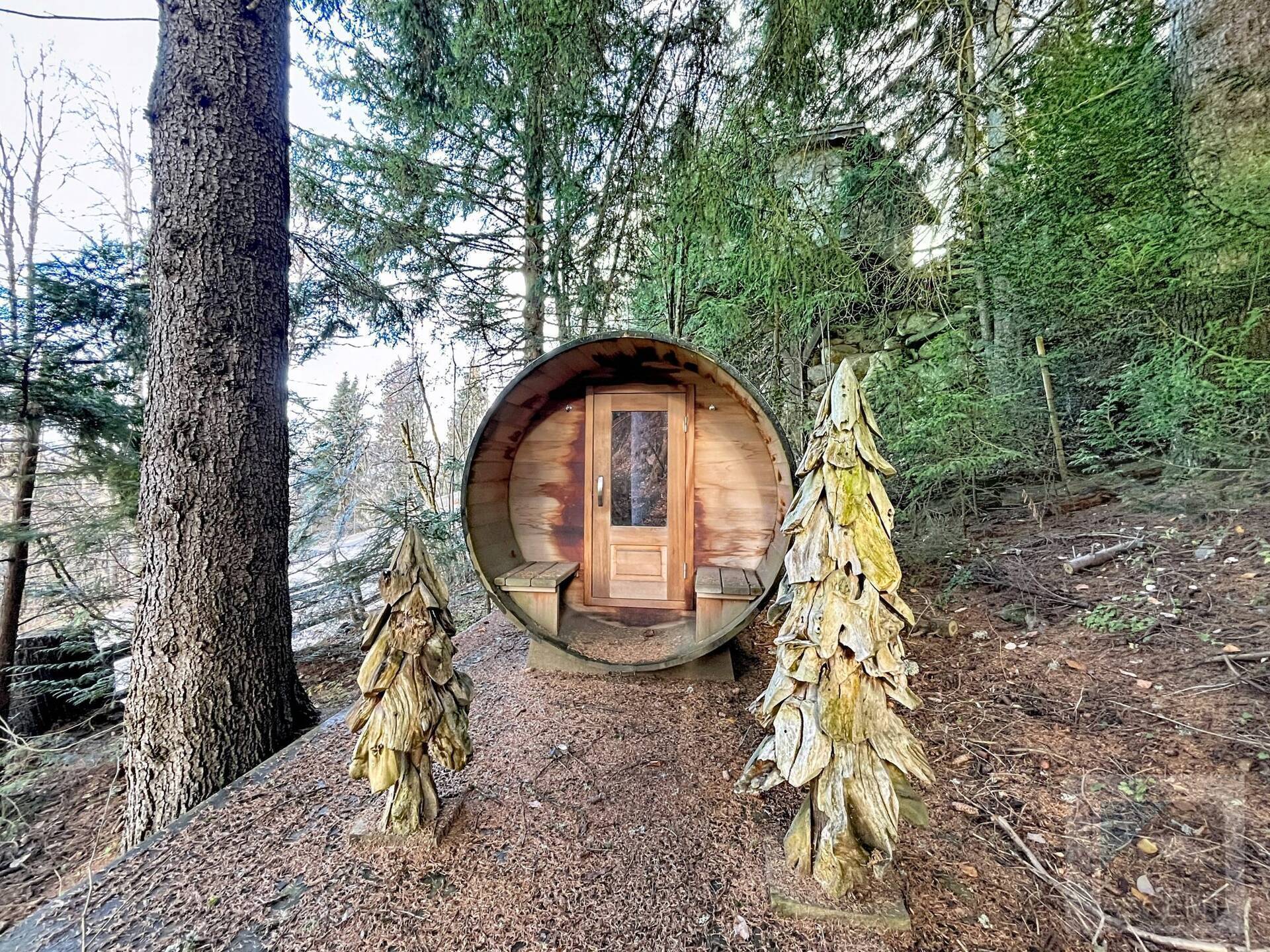 L'appartement en triplex avec double entrée dont une indépendante, donne l'impression de vivre dans un chalet. Il est distribue? comme suit : Au rez-de-jardin: 1 chambre double (lit 160 x200 cm) avec acce?s au jardin ; 1 chambre avec un double (lit 140 x200 cm) avec acce?s au jardin et 1 chambre avec lit superpose? ; 1 salle-de-bain luxueuse avec 1 grande baignoire et 1 douche a? l'italienne se?pare?e ; toilettes se?pare?es. Etage intermédiaire : 1 cuisine ame?ricaine équipée ; 1 salle-a?-manger (30m2), chemine?e et acce?s aux balcons (vue donnant sur les sapins et les montagnes) ; 1 chambre double (lit 160 x200) avec dressing, salle-de-bain et toilettes se?pare?es. Etage supe?rieur : 1 cuisine ame?ricaine ouverte sur un grand salon (40m2) avec chemine?e et acce?s aux balcons, (vue sur les sapins et les montagnes) ; 1 chambre double (lit de 160 x200) ; 1 salle-de-bain avec jacuzzi ; toilettes se?pare?es ; Grand ski room à l'entrée. A l'exte?rieur : 1 jardin privatif (500m2) joliment arbore? avec 1 un espace 'fire pit' (pour faire des feux de camp le soir autour d'un ape?ritif) ; 1 sauna inde?pendant et 1 garage double garage (accès direct à l'appartement).