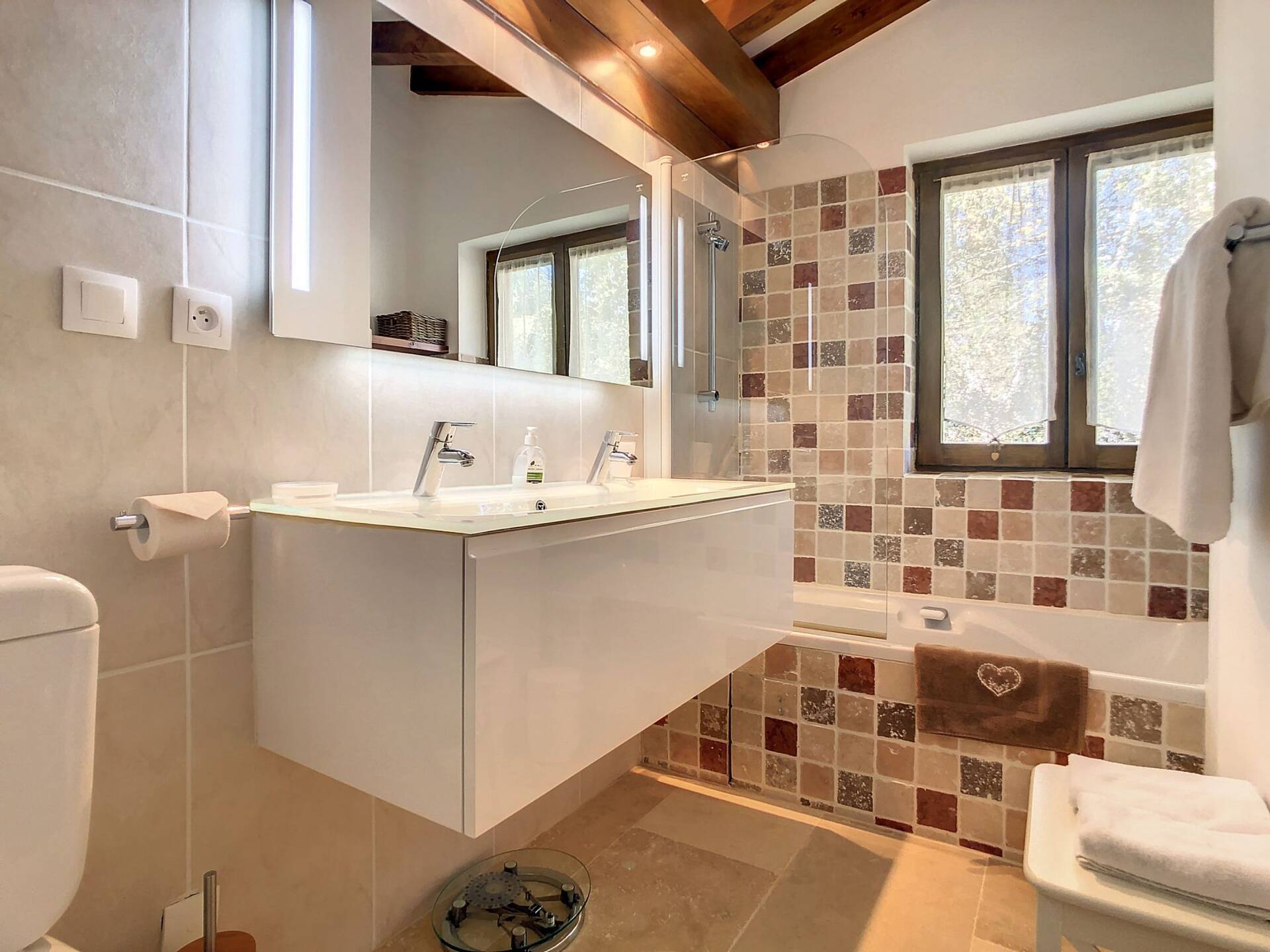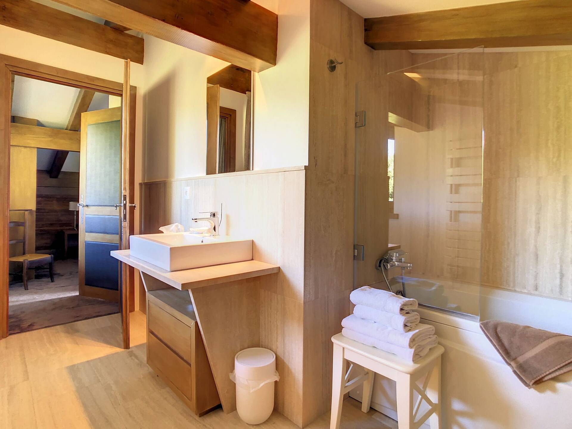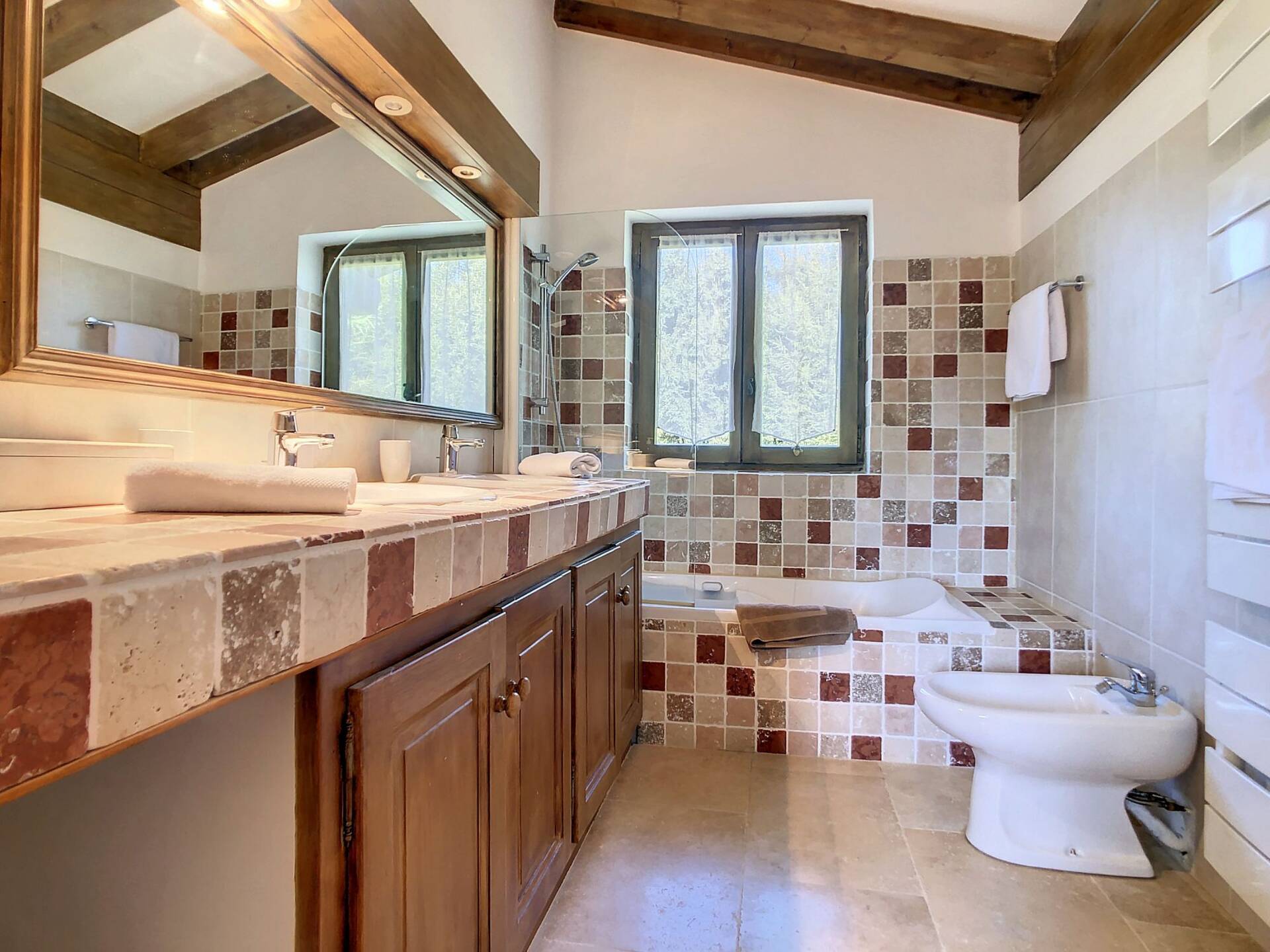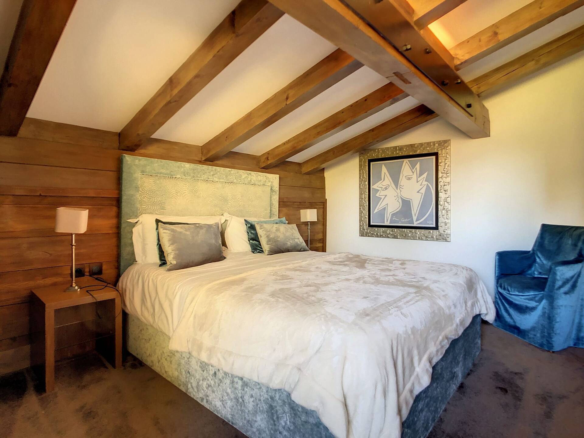 L'appartement en triplex avec double entrée dont une indépendante, donne l'impression de vivre dans un chalet. Il est distribue? comme suit : Au rez-de-jardin: 1 chambre double (lit 160 x200 cm) avec acce?s au jardin ; 1 chambre avec un double (lit 140 x200 cm) avec acce?s au jardin et 1 chambre avec lit superpose? ; 1 salle-de-bain luxueuse avec 1 grande baignoire et 1 douche a? l'italienne se?pare?e ; toilettes se?pare?es. Etage intermédiaire : 1 cuisine ame?ricaine équipée ; 1 salle-a?-manger (30m2), chemine?e et acce?s aux balcons (vue donnant sur les sapins et les montagnes) ; 1 chambre double (lit 160 x200) avec dressing, salle-de-bain et toilettes se?pare?es. Etage supe?rieur : 1 cuisine ame?ricaine ouverte sur un grand salon (40m2) avec chemine?e et acce?s aux balcons, (vue sur les sapins et les montagnes) ; 1 chambre double (lit de 160 x200) ; 1 salle-de-bain avec jacuzzi ; toilettes se?pare?es ; Grand ski room à l'entrée. A l'exte?rieur : 1 jardin privatif (500m2) joliment arbore? avec 1 un espace 'fire pit' (pour faire des feux de camp le soir autour d'un ape?ritif) ; 1 sauna inde?pendant et 1 garage double garage (accès direct à l'appartement).